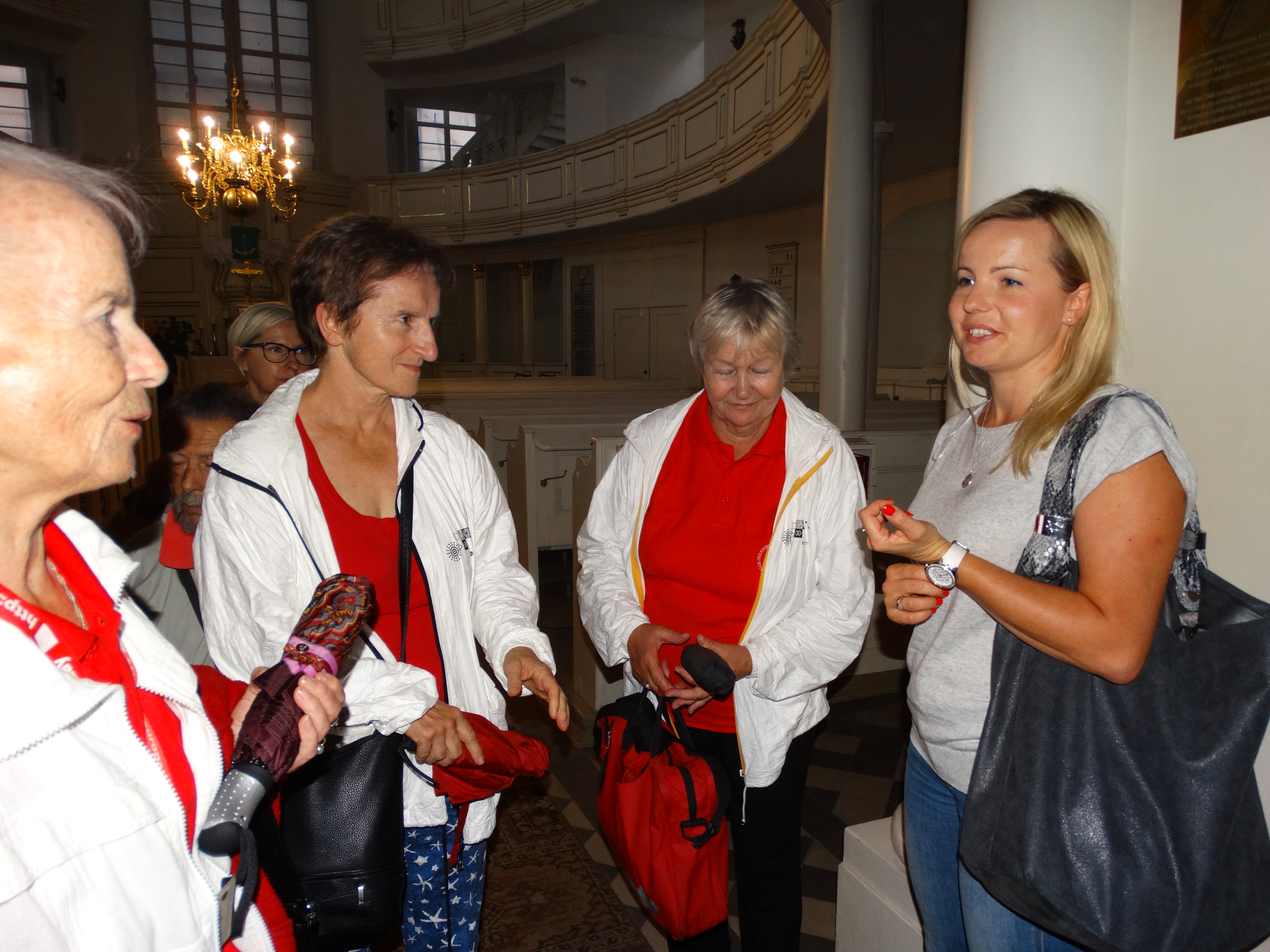 Kiedy pojawiliśmy się w umówionym miejscu, czekali na nas przewodnicy. Miejscem spotkania była Kryształowa Planeta, nazywana również „Matką Ziemią” (to przepiękna rzeźba). Mieliśmy cudowną, słoneczną i wyjątkowo ciepłą pogodę. Z ciekawością zaglądaliśmy do wnętrza każdego kościoła, z wyjątkiem synagogi, gdyż sobota jest w judaizmie dniem świątecznym. Obejrzeliśmy ją z zewnątrz, mieliśmy również okazję posłuchać pięknych śpiewów. Nasze zwiedzanie było poprzedzone fascynującymi informacjami ze strony znawców tych obiektów. Jak już wspomniałam, oprowadzali nas wrocławscy przewodnicy. Było ich kilku, a każdy posiadał ogromną wiedzę na temat danego kościoła. O cerkwi opowiadał nam ksiądz prawosławny, nazywany również „batiuszką”. Po obejrzeniu trzech wspomnianych wyżej miejsc kultu udaliśmy się do kościoła ewangelickiego przy ul. Kazimierza Wielkiego. Podczas, gdy słuchaliśmy opowieści pani przewodnik i podziwialiśmy przepiękny ołtarz – ambonę, lunął deszcz. Wcale nam to nie przeszkadzało, że pada za oknem, bo to był już koniec naszego zwiedzania (wszystkie obiekty sakralne zwiedzaliśmy w ciągu 2.5 godziny). A później zaplanowany był obiad w Ewangelickim Domu Parafialnym „Pod Aniołami”. Podczas posiłku podjęliśmy decyzję, że zwiedzamy jeszcze Rynek, tym bardziej że byliśmy w jego pobliżu. Pełni humoru z parasolami w rękach, udaliśmy się w kierunku kościoła św. Elżbiety, a stamtąd do Sky Tower. Należy dodać, że Sky Tower to wieża widokowa (200 m n.p.m.), z której można zobaczyć panoramę stolicy Dolnego Śląska, a przy słonecznej pogodzie wypatrzyć również Śnieżkę. Tak się złożyło, że nasza grupa podziwiała Wrocław „w objęciach” rzęsistego deszczu.